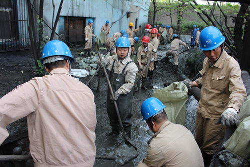 面对成本压力和生存挑战,大冶铁矿选矿车间强化全员节约意识,组织职工对现场各处积矿进行回收,实现颗粒归仓,保证沟渠畅通。图为职工对脱水循环水沟渠内的残矿积矿进行回收。 武钢大冶铁矿 方国俊 摄影报道