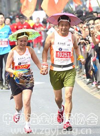 在日前举办的2013年重庆国际马拉松比赛上,52岁的中冶建工集团钢构公司员工肖正兰拉着丈夫的手,以2小时24分30秒的成绩完成了“半程马拉松”(