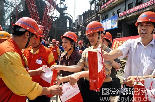 7月19日,湖北省总工会党组副书记、工会副主席楮玲将香皂、毛巾等防暑降温用品送到奋战在一冶武钢四号高炉大修工地上的农民工手中。②