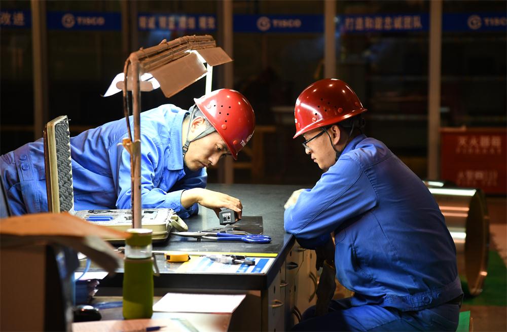 11月18日,太钢精密带钢公司两名职工通过剪下的样品测量不锈钢厚度,探寻进一步改进生产工艺提升产品质量的方法。