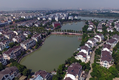 5月22日,无人机俯瞰治理后的洪山区水蓝郡内湖美景。由中国一冶城建公司施工的武汉市南湖片区水蓝郡内湖治理工程已进入最后收尾阶段,正在进行小区内湖微生物治理,内湖拦杆修复和小区绿化施工。