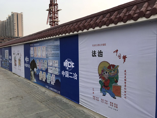 通过打造安全文化,彰显标化工地的深厚文化底蕴,提升企业社会信誉。在成都二十中学改扩建工程中,以创建“四川省安全生产文明施工标准化工地”为目标,做好安全环保前期策划,其办公区、生活区以及施工现场全部实施“同一化”管理,彰显了中冶集团和中国二冶对外形象。步入现场,映入眼帘的是覆盖着棕红色琉璃瓦古朴典雅的500多米施工外围墙,围墙上展示的中冶企业文化、中国二冶集团简介、企业资质和业绩、社会主义核心价值观、工程效果图异彩纷呈,成为城市街头一道唯美靓丽的风景线。办公区的宣传栏,企业简介、重点工程图片、工程形象进度表、安全知识长廊、企业文化长廊及生活内的职工夜校,则尽显了颇具魅力的中国二冶企业文化特色。特别是通过安装高清网络硬盘录像机,对办公区、生活区、施工区实施360°监控,为规范工地管理提供了支撑。针对该工程处于金牛区人员密集地段的实际,践行绿色环保施工理念,对部分噪音大的分项工程采取与学生上课时间错峰施工,材料采用夜间进场,土方夜间进行挖运的方法,实现了节能、节地、节水和环境保护并减少了对环境的负面影响,赢得了业主和社会各界“精锐之师、文明之师”的高度评价。