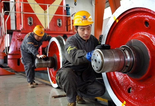 4月25日,河钢唐钢物流公司设备维检创新工作室成员正在对解体的内燃机车轮对进行维检技术攻关。