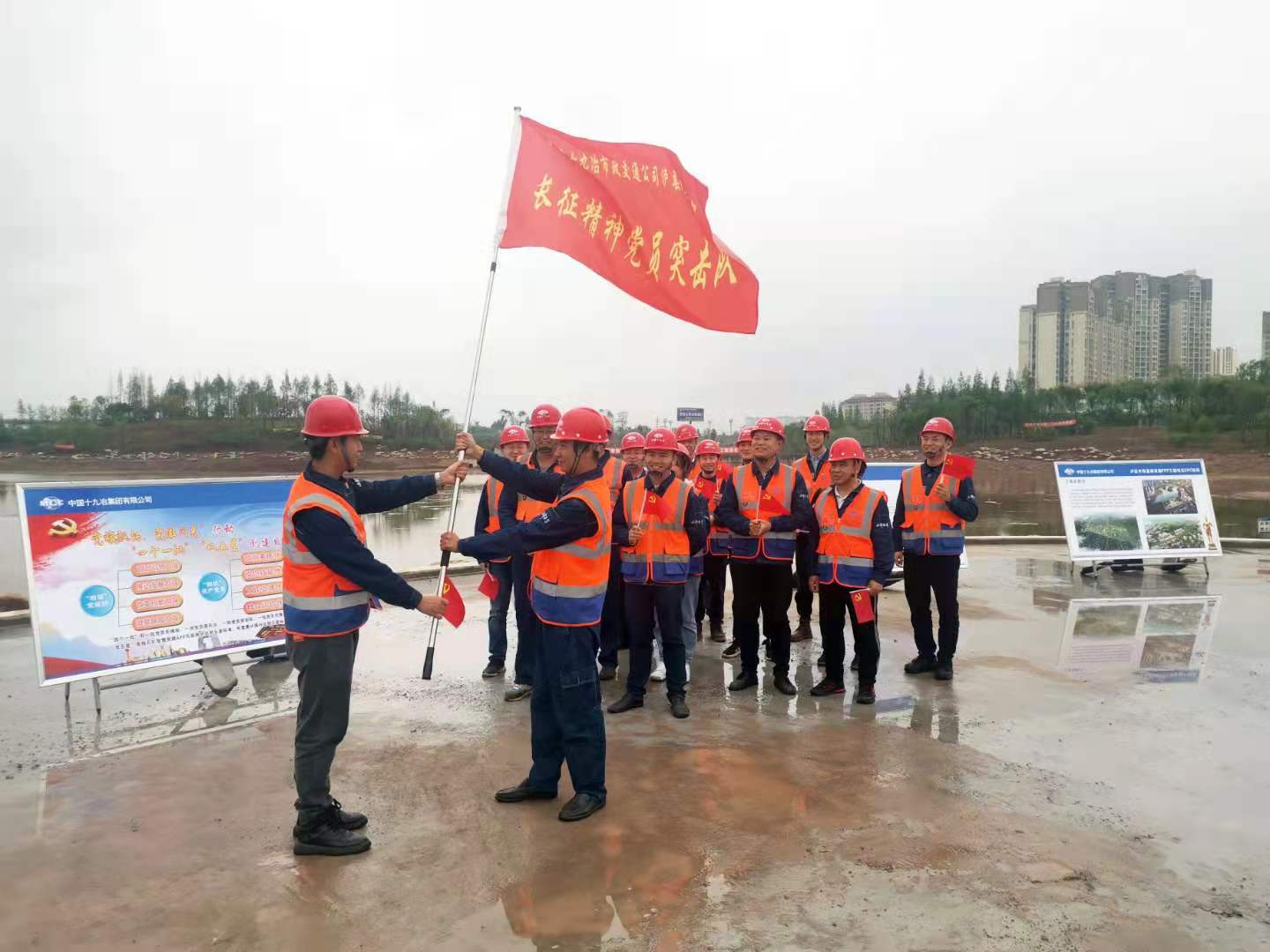 在办实事、开新局环节,项目负责人组织政府、业主、监理、设计等单位代表和媒体记者,依次来到已投入使用的城东道路、“网红路”冱水路、玉蟾大道和在建的龙湖湿地公园施工现场进行观摩,向大家介绍泸县PPP项目概况、党建引领、质量、安全、环保、社会责任、工程进度、农民工管理、项目建设成果等情况,进一步展示公司的标准化管理以及项目管理亮点,彰显中冶品牌形象。在龙湖湿地公园施工现场,举行了“长征精神突击队”授旗仪式,各方代表表达了“践行初心使命,认真履职尽责”的决心。项目全体员工在“请战书”上签字,立下了坚决完成目标任务的铮铮誓言,并纷纷表示将以过硬的工作作风和突出的工作成效,擦亮党员身份,承诺践诺,争创一流。参观完毕后,全体活动人员围绕安全环保、项目建设、工程质量、工程进度等情况进行了座谈交流,深入了解泸县PPP项目的建设亮点。项目部全体人员表示,将从党史学习教育中汲取前进力量,以圆满完成重点任务的实际行动和工作业绩检验活动成果,将“长征精神”落实到项目建设中,争取提前完成施工任务,让项目早日发挥经济效益,建设人民满意的精品工程,展现中国十九冶“西部铁军”风采,助力地方经济发展。