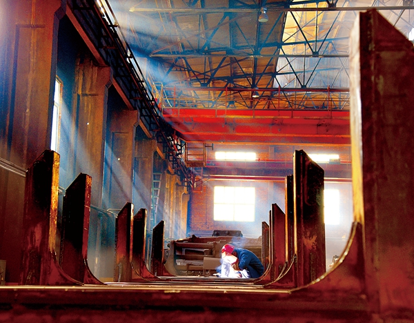 5月16日,太钢物流中心车辆作业区职工在焊接检修车架。