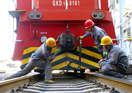 5月18日,河钢唐钢物流公司炼钢站作业区安全管理人员正在和岗位职工进行内燃机车牵引装置安全点检交流。