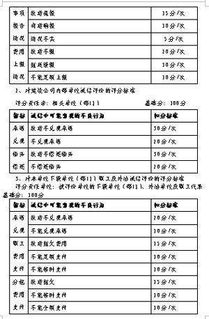 6、评价体系的主体 这里所说的主体是参加评价活动的参与者,企业内部诚信评价体系与一般企业信用评价(评级)不同的一个重要方面,就是主体的归一性,即企业内部诚信评价的被评价对象、评价人及评价结果的使用人都是内部单位(部门),而社会上企业信用评价(评级)评价结果的需求者、评价结果的提供者和评价对象往往都不同主体,评价结果的提供者大都是独立中介机构。我公司的诚信评价的主体是公司直接管理单位(部门)。 7、评价的方法 由于评价主体的归一性,所以采用的是“人人评我,我评人人”的评价方法,这个区别于目前信用评估所经常采用的“统计法、有限专家评价法和专家评价法”。 8、体系的评价结果分级 我公司企业内部诚信等级采用的是五级制,没有采用银行通行的“AAA至C”九级制,这样设定等级既有效区别对象的诚信程度,又简单明了,有利于操作,用星级表示形象生动,容易被接受。 9、评价的程序 公司企业内部诚信评价体系的程序是: