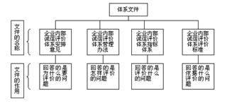 公司企业内部诚信评价体系有四个主要文件组成,它们从不同的角度对企业内部诚信评价体系的建立和运行做出了详细的规定和说明,构成了企业内部诚信评价体系的框架,体系文件构成及它们的作用关系如下