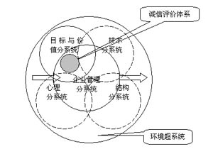 系统管理理论把企业看成是一个赢利性的、复杂的社会技术经济系统,其代表人物卡斯特和罗森茨威克提出了企业系统的一般模型①,按照这一理论把企业内部诚信评价体系定位是管理分系统中的一个子系统,是目标与价值分系统中的一个子系统,处于管理分系统和目标与价值分系统相互交叉相互重叠相互作用的位置上,这表明企业内部诚信评价体系不是游离于经营管理活动之外的一个独立系统,而是融合在企业经营管理活动之中的一种管理行为。如图:
