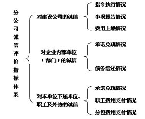 ①〔美国〕弗里蒙特·卡斯特,詹姆斯·罗森茨威克著,李柱流等译《组织与管理》,中国社会科学出版社,1985版第23页。 4、体系建立的几个问题 (1)建立体系的指导思想 以“三个代表”重要思想为指导,企业诚信文化建设为基础,以员工的特别是管理者的诚信道德的培育为核心,根据企业特点及企业内部诚信的现状设计出适应企业内部诚信评价的指标体系,并以此为基础建立起有效的诚信激励和惩戒机制。 (2)建立体系的目标 一个覆盖公司全体员工、公司内部单位部门的与社会诚信体系逐步接轨的诚信评价体系和诚信档案系统是建立企业内部诚信评价体系的最终目标。 (3)建立体系的方法 建立企业内部诚信评价体系是一项紧迫而长期、复杂而细致的工作,根据二十冶企业内部诚信的实际状况,公司采用分级建设、分步实施的方法进行,分级建设就是按照企业的组织结构和干部管理权限,上级组织负责对直接管理的下级组织和员工的企业内部诚信评价体系的建设。分步实施就是坚持“着眼长远,立足当前,先易后难,循序渐进”的方针,一步一步的推动,在评价指标的设置方面,初期的评价指标将不引入基本情况诚信价值指标、能力业绩诚信价值指标和资产财务诚信指标,而先将说实话、办实事作为考核评价指标。随着诚信体系完善,公司内部诚信状况好转,逐步升级。在评价的范围方面,也是从小到大、逐步扩大,最终达到覆盖全公司的目标。
