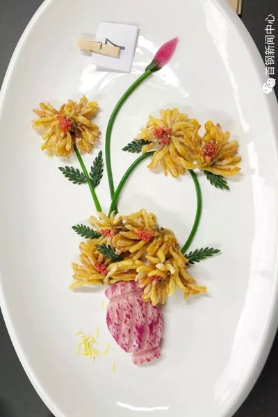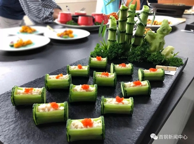决赛现场,25名选手头戴厨师帽、身穿洁白厨师服,在灶台前像魔术大师一般将手上功夫运用得出神入化,把“水火交攻”的把戏玩到炉火纯青,将不同食材、不同调味品,通过不同烹饪手法的变换,以及选手们久经“烟火”的经验和“刀尖”上的历练,使普通食材到达美味的境界,一道道秀色可餐的美食端上餐桌,展示了首钢职工高超的职业技能。