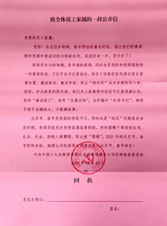 开年之际,为构建家庭和单位双层反腐防线,打好新一年反腐倡廉“预防针”,中国十九冶城建公司纪检部门精心制作了96封“特别”信件,开展“廉洁家书到我家”主题倡廉活动,推进家庭助廉。