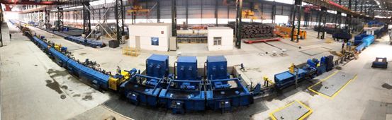 晋钢高棒生产线由中冶京诚负责EPC总承包,轧线采用全连续高速无扭轧制,最大轧制速度45m/s。该生产线定位于建筑用材小规格棒材,生产规格为∅10mm~∅16mm的螺纹钢,配备了中冶京诚新一代CMM-I系列模块化230精轧机机组、高速伺服倍尺飞剪、夹尾器及转鼓系统,粗中区采用第五代高刚度短应力线轧机,具备终轧速度快、产量高、成材率高、产品表面质量高、产品尺寸公差控制精确等优点。