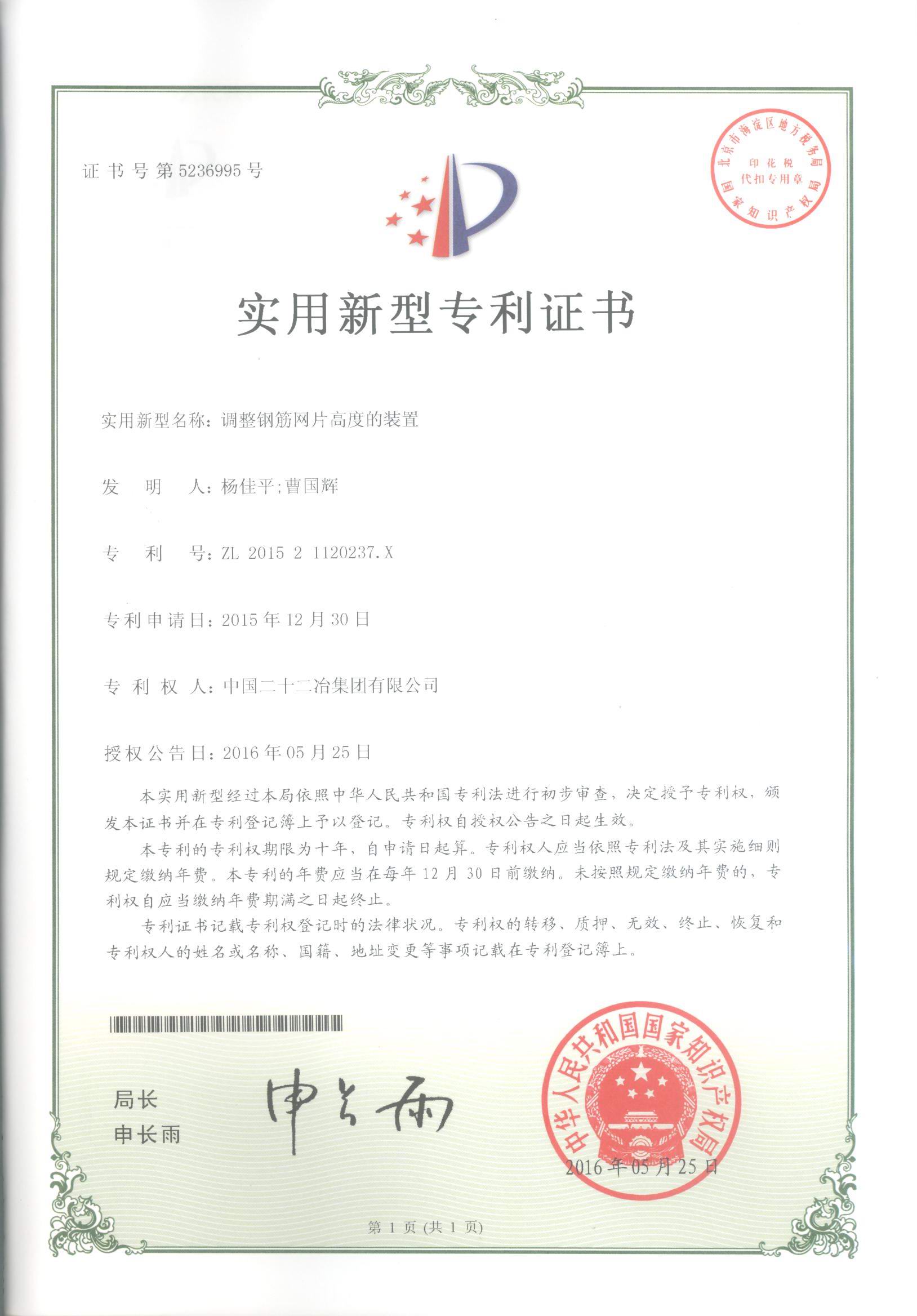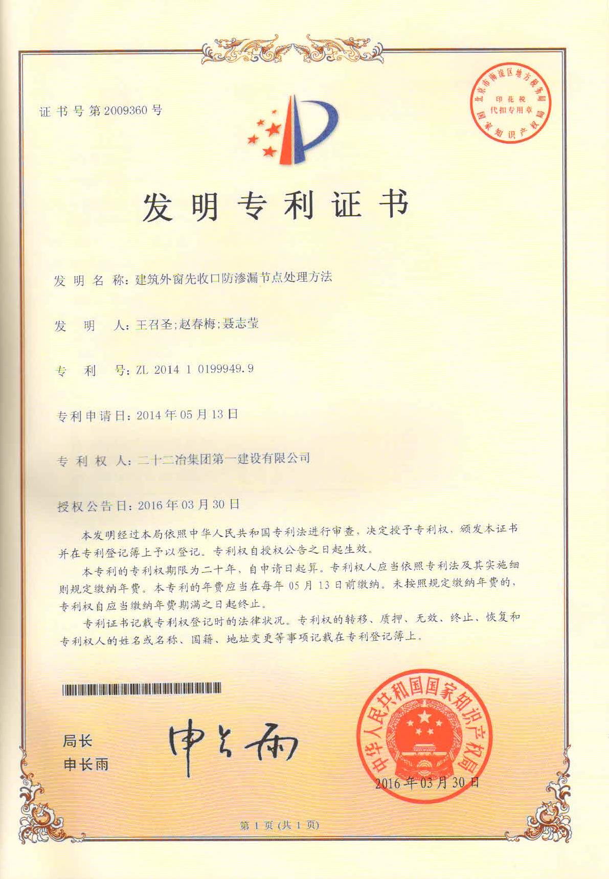 8月31日收到证书,中国二十二冶集团《建筑外窗先收口防渗漏节点处理方法》获国家发明专利授权,《调整钢筋网片高度的装置》获实用新型专利授权。