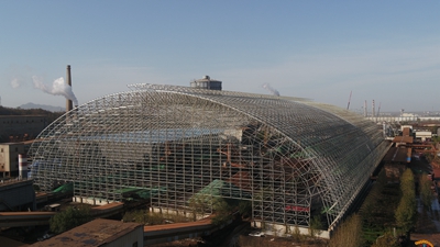 该工程位于山东省济南市莱芜区,为泰钢环保改造重点工程,结构型式为螺栓球节点正放四角锥筒形网架,长度为448米,高度为52米,跨度为149.7米,为目前国内最大跨度的单层螺栓球网架结构。