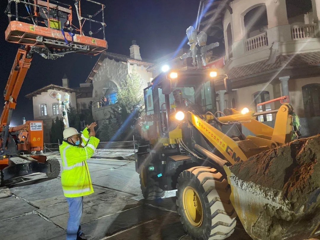 在党支部的组织下,职能管理部门、南区、北区和 AD 区组成的四个党小组积极响应,精心部署。第一党小组主要以商务管理部、综合办公室、计划部、技术质量部、安全部等部门为主场景,在内部开展拍摄工作。第二党小组和位于北区的第三党小组则分别聚焦于在南区好莱坞大道两侧主题商店从事湿作业相关工作与在 114 单体 GFRC 吊装及主题上色区域工作的工人,记录他们在工作中的点滴。第四党小组以前场道路彩混浇筑、水磨石施工等工作场景为主,用镜头捕捉建设者们在施工现场的最美瞬间。