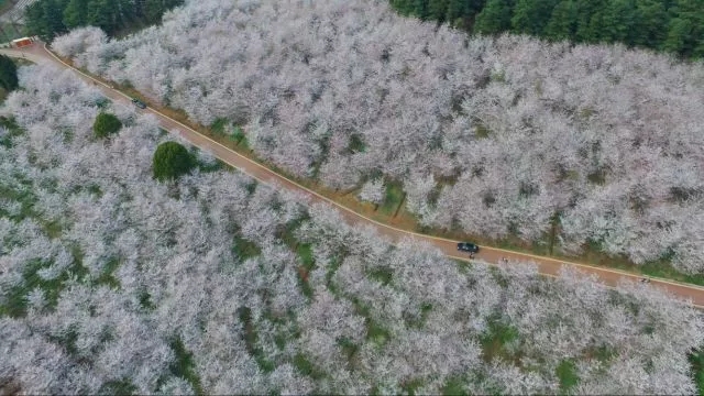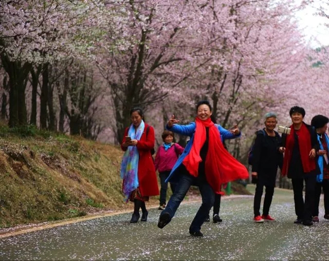 盛花期,早樱娇俏烂漫,香气浮山,周游其中,仿佛来到粉云雾绕的海边;晚樱桃红柔媚,与嫩芽相伴更显韶华流动,让人置身风飞花舞的雨中。