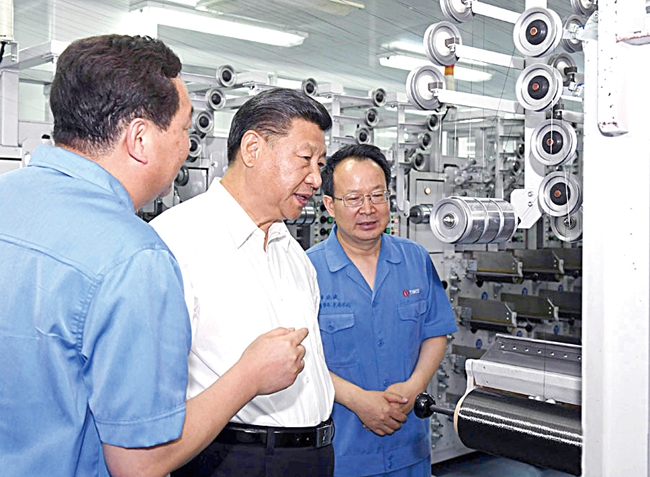 6月22日,中共中央总书记、国家主席、中央军委主席习近平在山西太原考察企业。图为习近平在山西钢科碳材料有限公司考察时,正在听取太钢党委书记、董事长李晓波的汇报。(新华社记者 李学仁 摄)