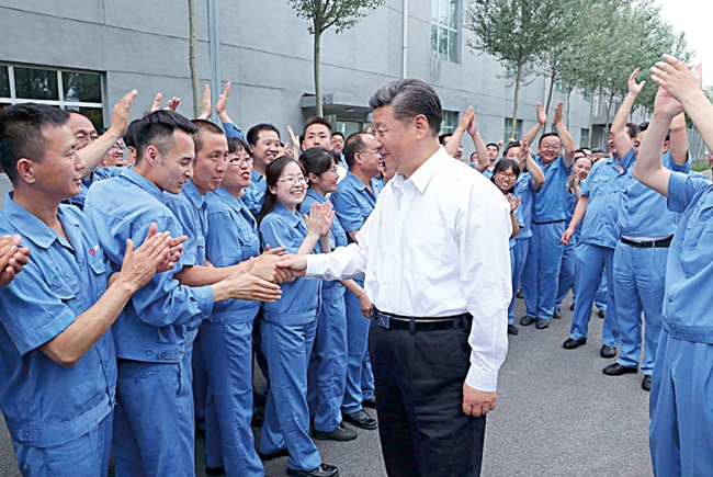 6月22日,中共中央总书记、国家主席、中央军委主席习近平在山西太原考察企业。图为习近平在山西钢科碳材料有限公司同职工亲切交流。(新华社记者 庞兴雷 摄)