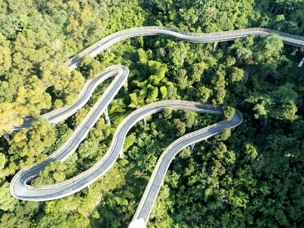 国际领先水平超长森林步道的人性化设计技术,是在密林山地超长镂空人行栈桥设计创新,镂空的格栅钢板桥面构造综合考虑安全性、舒适性以及透光、透水的生态要求,还综合考虑了儿童安全、结构美学等要素,极大的提升了各类人群的步行舒适度。