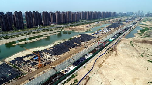 空中俯瞰下的银川银川中阿之轴地下管廊工程正在加紧施工中。