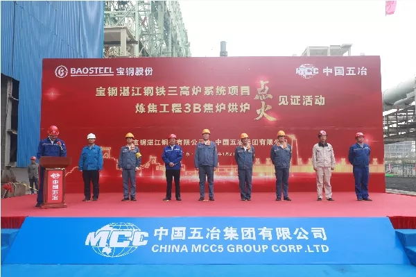湛江钢铁三高炉系统炼焦工程包括2座65孔炭化室高7米大容积复热式顶装焦炉,配套3座100吨/小时干熄焦设施、1座30兆瓦抽汽凝汽式汽轮发电机组,年产干全焦160万吨,煤气处理量9万立方米/小时,是高炉系统项目的关键生产环节之一。此次3B焦炉作为三高炉系统项目炼焦工程首座点火烘炉的焦炉,标志着三高炉系统炼焦工程进入投产倒计时,为整个三高炉系统工程建设吹响了集结号。