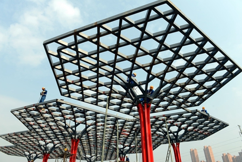 2月25日下午,工人正在安装焊接“钢花飞溅”钢结构造型景观。由中国一冶承建的武汉市重点工程青山江滩二期工程第一段覆土建筑堤顶出口“钢花飞溅”造型景观正在进行安装焊接施工。