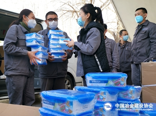 图为河钢唐钢物流分公司工会人员正在为职工发放饭盒。
