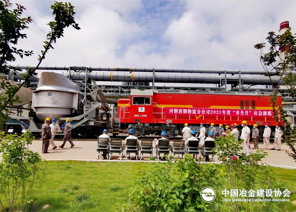6月16日,唐钢物流分公司新区铁钢站铁水运输现场铁水车跑漏铁事故模拟应急演练正在紧张进行。