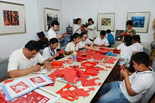 在一冶版画研究院展厅内,武汉市美术家协会副主席、武汉市版画家协会会长、中国一冶版画研究院院长傅树清先生为夏令营团员们讲述了一冶工业版画发展历程,并对版画印制流程作了演示,小团员们饶有兴致的操作各种版画制作工具;由一冶职工子女、美国两地青少年共同完成了以“和”字为中空贴剪纸的中轴书法“汉字创意”作品,“和”字取习近平“人类命运共同体”和“世界和平发展”的倡议,分別由青少年签名后将赠送两国领导人,意在祈愿中美携手,营造和平大同世界;在书法练习区和剪纸、汉绣、古筝学习区域,两地的青少年认真交流切磋,互相帮助学习,对中国的传统非遗文化有了直观地认识和体验。