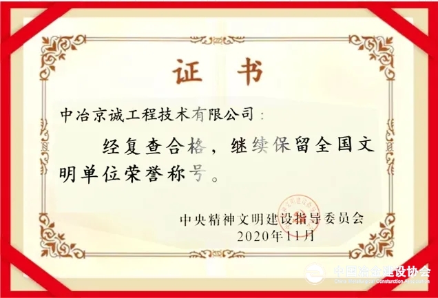 近日,中冶京诚顺利通过2020年全国文明单位复核,继续保留“全国文明单位”称号,这是中冶京诚自2011年被评为全国文明单位,十年来一直保持此项殊荣。同时,中冶京诚获评2018-2020年度“首都文明单位标兵”称号,这是中冶京诚自2003年以来连续获得这一殊荣。