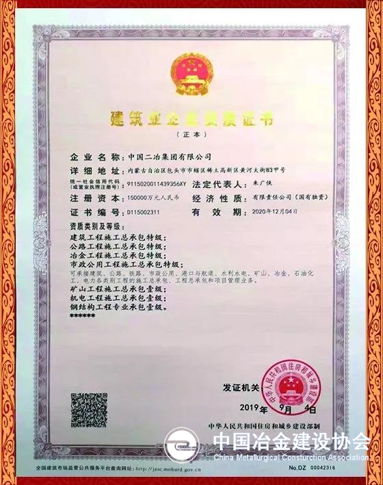 9月6日,经国家住建部核准,中国二冶集团荣获国家“市政公用工程施工总承包特级资质”、“市政行业甲级设计资质”,“公路工程施工总承包特级资质”“公路行业甲级设计资质”。至此,中国二冶集团已拥有市政、公路、建筑、冶金四项工程施工总承包特级资质和市政行业、公路行业、建筑行业、冶金行业四项行业甲级设计资质,成为内蒙古自治区首家、中冶集团第二家“四特四甲”资质企业。