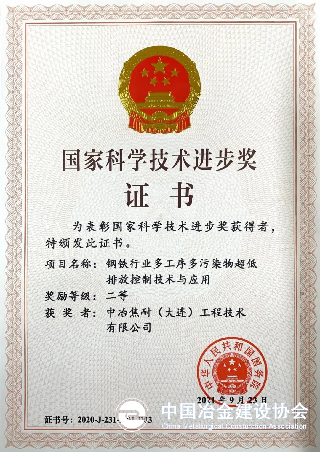 11月3日上午,中共中央、国务院在北京人民大会堂隆重举行2020年度国家科学技术奖励大会。大会共颁发国家自然科学奖、国家技术发明奖、国家科学技术进步奖264项。其中,自然科学奖46项,技术发明奖61项,科技进步奖157项。中冶集团牵头和参与完成的4项成果荣获2020年度国家科学技术奖,其中,由中冶集团直接提名、中冶建研院牵头获得国家技术发明二等奖;中冶长天作为第二完成单位参与获得国家科技进步一等奖,中冶京诚、中冶焦耐分别参与获得国家科技进步二等奖。