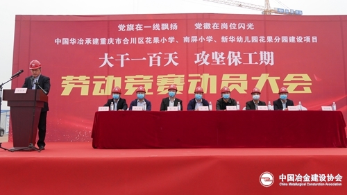中国华冶两级工会“大干一百天 攻坚保工期”劳动竞赛动员大会日前在西南分公司合川教育建设项目现场举行。重庆市合川区花果小学、南屏小学、新华幼儿园花果分园建设项目是合川区2020年重点民生项目,是合川区学位保障工程建设的首批项目。此次劳动竞赛,是西南分公司贯彻落实集团公司“大干二季度 确保双过半”会议精神的具体实践。让党旗在一线飘扬,让党徽在岗位闪光,迅速掀起大干快上建设热潮,确保3所学校在今年9月顺利投入使用。