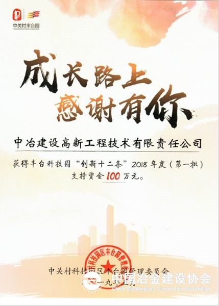 8月12日,中冶建设高新工程技术有限责任公司接到批复函,获得了丰台科技园“创新十二条”2018年度支持企业(第一批)奖励资金,同时,中冶建设也顺利通过了2018年度第21批北京市企业技术中心认证。