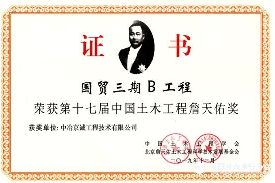 2019年第十七届中国土木工程詹天佑奖的评选中,国贸三期B工程项目在追求建筑和环境友好结合、抗震性能优化设计、建筑舒适度模拟分析、采用“冰蓄冷+低温送风+变风量”组合式制冷系统等充分考虑舒适、安全、节能环保等方面的创新一路领先。同时,公司还配合施工单位完成了施工方面的创新,在确保工程效率及准时竣工方面提供了有力保证。赢得了组委会的一致肯定,这项殊荣是对中冶京诚在科技创新与新技术实际应用方面所取得的卓越成绩给予的莫大肯定。项目根据自身优秀的设计及多项创新,此前已斩获北京市、冶金行业等诸多平台多项大奖。