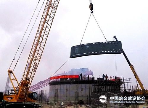日钢精品基地一号高炉第一带炉壳开始吊装