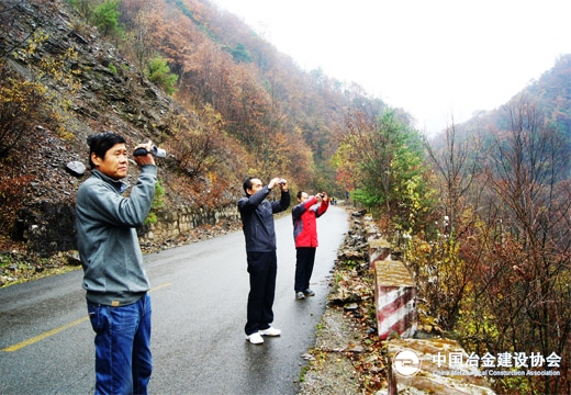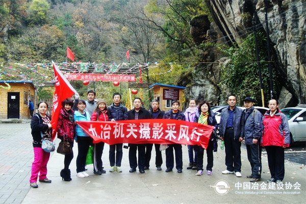 深秋的大箭沟景色迷人,五彩斑斓的山野,清新的空气,潺潺的流水,不时还可以看到石拱小桥和观景亭。沿着谷底的木制通廊斗折蛇行,一步一景,景景各异,令人赏心悦目。面对此情此景,摄影爱好者们手机、相机齐上阵,俯、仰、蹲、趴、攀,各种姿势尽显神通。拍摄的咔嚓声,爽朗的笑声,再加上鲜艳的“九冶建设”旗帜,在山谷中形成了一道美丽的风景线。