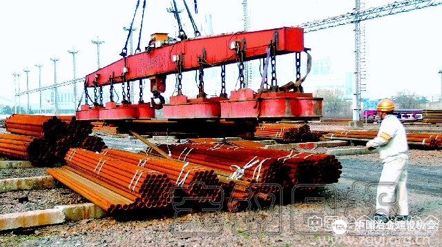 宝钢发展物流分公司通过改进电磁吊具,使吊具功能进一步拓展,不仅能吊运钢板还能吊运钢管(如图),提高了场地作业效率。