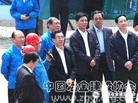 贺国强等领导在首钢京唐公司5500立方米高炉现场听取工程建设情况汇报。李宝山 摄