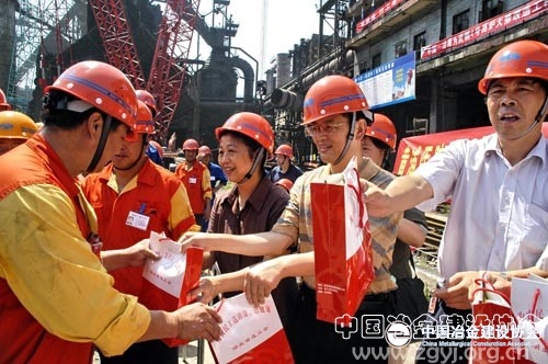 7月19日,湖北省总工会党组副书记、工会副主席楮玲将香皂、毛巾等防暑降温用品送到奋战在一冶武钢四号高炉大修工地上的农民工手中。②