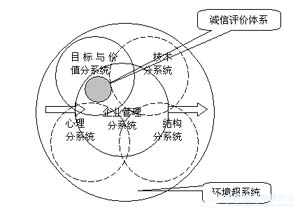 系统管理理论把企业看成是一个赢利性的、复杂的社会技术经济系统,其代表人物卡斯特和罗森茨威克提出了企业系统的一般模型①,按照这一理论把企业内部诚信评价体系定位是管理分系统中的一个子系统,是目标与价值分系统中的一个子系统,处于管理分系统和目标与价值分系统相互交叉相互重叠相互作用的位置上,这表明企业内部诚信评价体系不是游离于经营管理活动之外的一个独立系统,而是融合在企业经营管理活动之中的一种管理行为。如图: