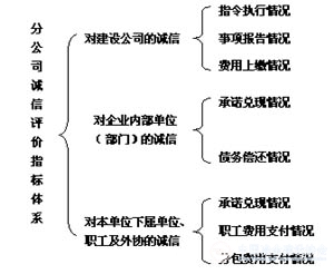 ①〔美国〕弗里蒙特·卡斯特,詹姆斯·罗森茨威克著,李柱流等译《组织与管理》,中国社会科学出版社,1985版第23页。 4、体系建立的几个问题 (1)建立体系的指导思想 以“三个代表”重要思想为指导,企业诚信文化建设为基础,以员工的特别是管理者的诚信道德的培育为核心,根据企业特点及企业内部诚信的现状设计出适应企业内部诚信评价的指标体系,并以此为基础建立起有效的诚信激励和惩戒机制。 (2)建立体系的目标 一个覆盖公司全体员工、公司内部单位部门的与社会诚信体系逐步接轨的诚信评价体系和诚信档案系统是建立企业内部诚信评价体系的最终目标。 (3)建立体系的方法 建立企业内部诚信评价体系是一项紧迫而长期、复杂而细致的工作,根据二十冶企业内部诚信的实际状况,公司采用分级建设、分步实施的方法进行,分级建设就是按照企业的组织结构和干部管理权限,上级组织负责对直接管理的下级组织和员工的企业内部诚信评价体系的建设。分步实施就是坚持“着眼长远,立足当前,先易后难,循序渐进”的方针,一步一步的推动,在评价指标的设置方面,初期的评价指标将不引入基本情况诚信价值指标、能力业绩诚信价值指标和资产财务诚信指标,而先将说实话、办实事作为考核评价指标。随着诚信体系完善,公司内部诚信状况好转,逐步升级。在评价的范围方面,也是从小到大、逐步扩大,最终达到覆盖全公司的目标。
