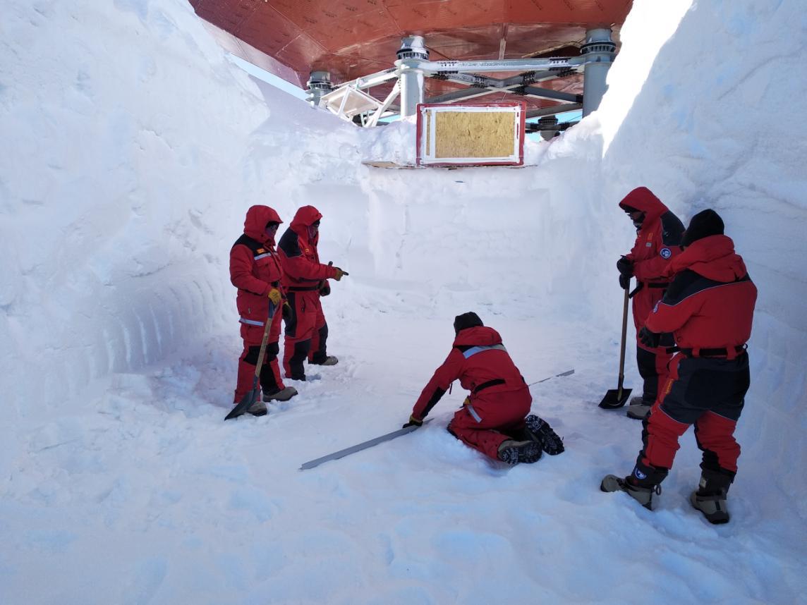 正如中国第35次南极科考泰山队队长姚旭所说,“这里盛行暴风雪,一次暴风雪就可以埋掉挖好的基坑,因此我们趁着刚来时的好天气,让所有队员都参与了主体建筑下部基坑的开挖,其他部分使用扬雪机,挖出了一个面积约300平方米、深5米的基坑,为二期工程的完成开了个好头。”
