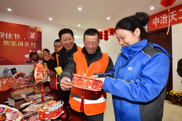在布置温馨、气氛热烈的工地会议中心,管理人员和农民工兄弟亲如一家,共同制作花灯和汤圆,大家分工合作,不一会儿,一盏盏颜色各异的花灯就制作完成了,小花灯在工地雄伟的钢结构主体旁闪闪发光,异常美丽;围坐在一起制作汤圆的农民工们,有说有笑地唠起了家常,兴致勃勃地用元宵摆起了“中冶天工”、“元宵节快乐”的字样;在猜灯谜环节,大家开动脑筋,享受头脑风暴后的成就感以及手捧礼物的愉悦感。在大家猜谜的过程中,热腾腾的汤圆出锅了,“这是我们第一次在工地过元宵节,感谢中冶天工,这汤圆吃起来,真暖心啊!”工地上来自江苏的老陈吃到了第一盆出锅的汤圆,他不禁有些激动。