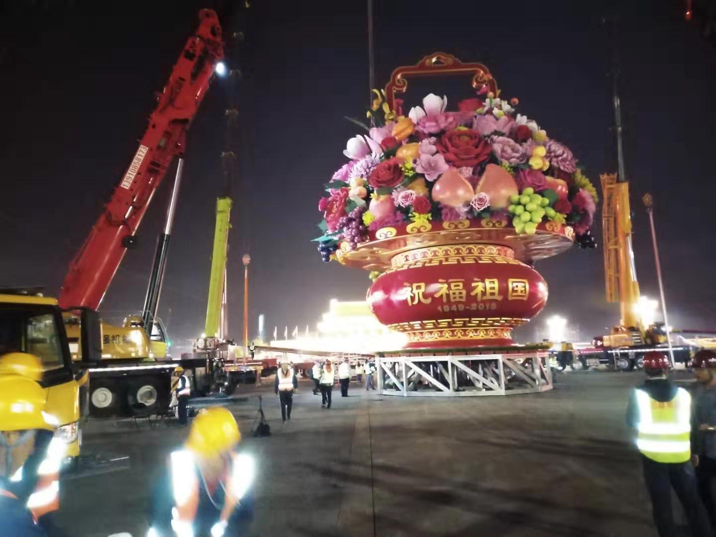 整个花坛顶高18米,花篮篮体高16米,篮盘直径12米,花坛底部直径45米。在篮体北侧书写“普天同庆,1949—2019”字样;在篮体南侧书写“祝福祖国,1949—2019”字样。同时花坛还布设了夜景照明装置,晚间灯光照射在花篮篮体上,将呈现美仑美奂的光影效果。 (首钢建设集团 赵泽民 文/图)