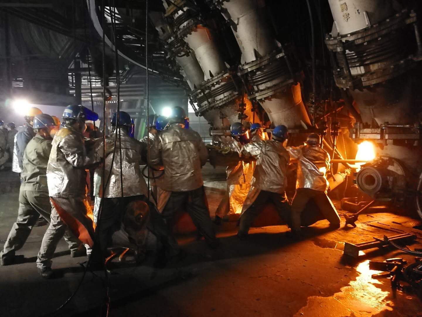 风口平台的中套是直接连接炉膛的,在风口拔出后,洞口会不断往外喷射炽热的火焰,不仅作业环境恶劣,对施工人员的人身安全也存在一定的威胁。40年前,拉拔中套使用游锤装置进行拆除作业。在拆除时先使用拉杆钩住中套内部,施工人员再将一根1米左右的道木推进中套卡紧拉杆,从外部用麻绳分侧拴住拉杆,施工作业人员30余人分站设备两侧拽紧麻绳,然后再使用撞杆进行反复撞击来使中套与大套分离。一次又一次使力,一声又一声呐喊。顺利的话,2到3小时左右才能完成1个中套的更换,在场作业人员皆筋疲力尽,全身早已湿透。要是遇上中套卡死的情况,就更加“要命”了。在努力了1个小时后,甚至出现拉杆都拉断了,中套依旧“纹丝不动”的情形,可能就是落料堆砸在风口上,导致中套变形卡住了。一旦发生此类情况,就需要加大人力物力的投入。30个人不够,就上50个,拉杆断了就换根新的接着拉。在此情况下,更换一个中套可能需要50余人配合耗费6至7小时。
