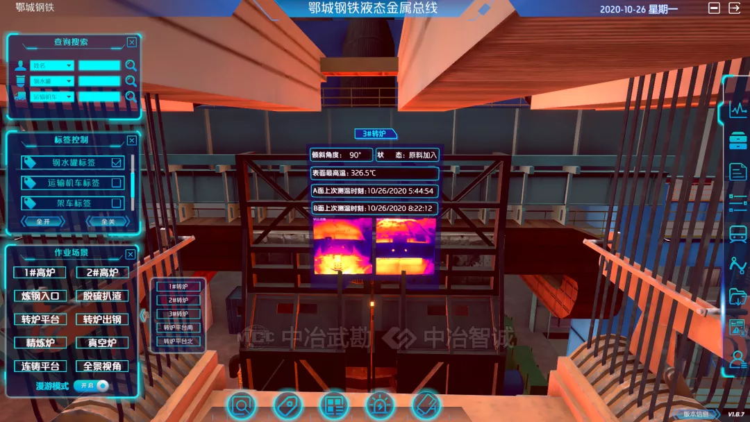 其中,由中冶智诚承建的“安全可视化平台”作为风险监控主线的重点项目,基于工业互联网和5G+北斗定位技术,以地理信息三维可视化技术为展现手段,以能源动态管控系统和经营管控系统为数据支撑,结合视频监控技术、5G+北斗定位技术、热红外测温技术,以直观高效的方式,实现了对钢厂液态金属安全可视化动态监测和煤气作业安全管理。