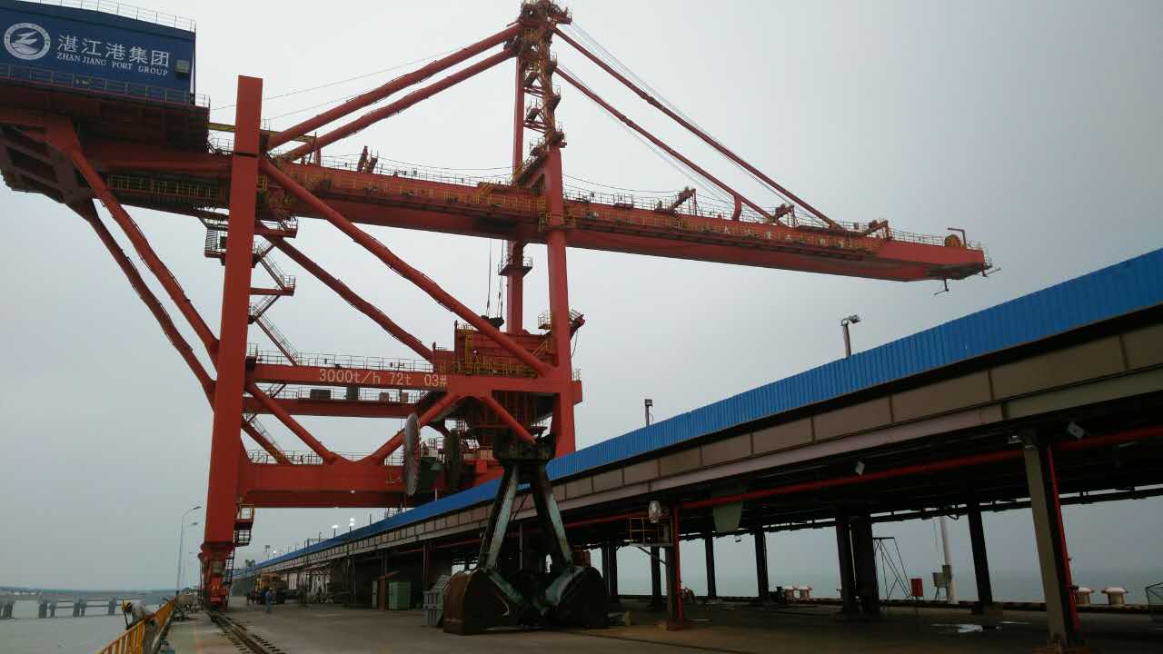 12月1日凌晨1时,随着4台卷扬机同时启动,经过一个多小时牵引,3000t/h抓斗式卸船机沿预定轨道滚装上码头,湛江钢铁30万吨原料码头迎来台风“彩虹”后第一位“客人”。