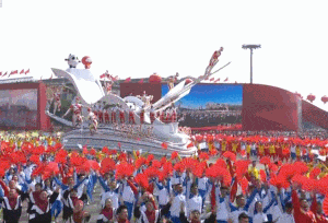 据了解,这面“五星红旗”是一张LED网幕,高60米、宽90米;“旗杆”是3组600吨的起重机。